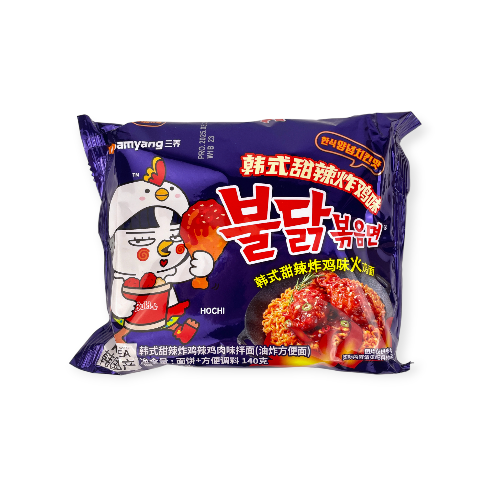 Samyang Buldak Sweet Korean Fried Chicken to wersja kultowych koreańskich makaronów instant, inspirowana popularnym daniem Yangnyeom Chicken (양념치킨) – smażonym kurczakiem w słodko-pikantnym sosie gochujang. To połączenie ostrości papryki z delikatną słodyczą pomidora, czosnku i cebuli, które daje wyrazisty, głęboki smak, ale z bardziej zrównoważonym poziomem pikantności niż klasyczny Buldak.