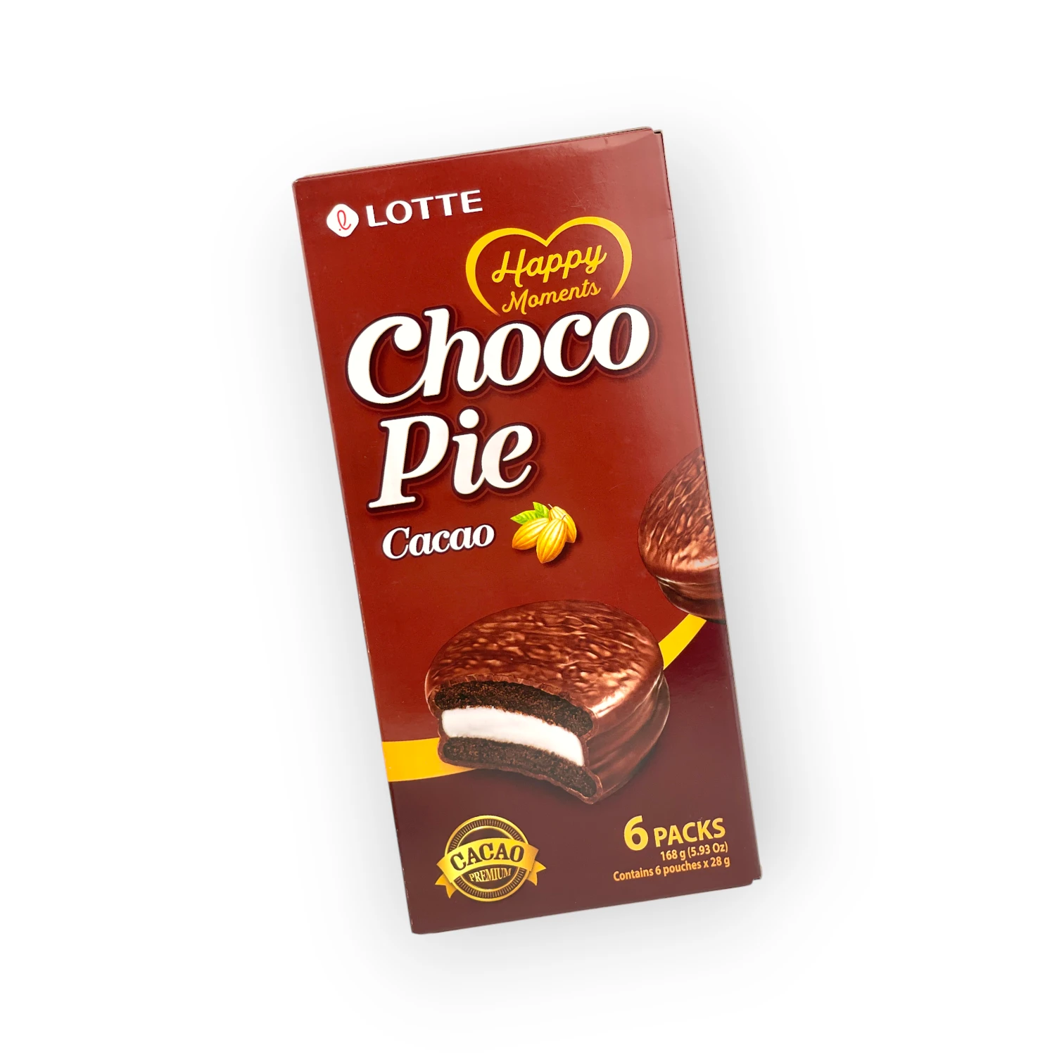 Ciastka Choco Pie o smaku czekoladowym od Lotte to absolutny must-have wśród legendarnych słodkich przekąsek 초코파이. Choco Pie są na rynku od lat 70. XX wieku i od tego czasu niezmiennie królują wśród przekąsek w Korei. Choco Pie Cacao to dwa mięciutkie, kakaowe biszkopciki, pomiędzy którymi znajduje się warstwa lekkiej pianki marshmallow. Całość oblana jest pyszną, mleczną czekoladą, tworząc małe, kanapkowe ciasteczka zwane też 'burgerami'.
