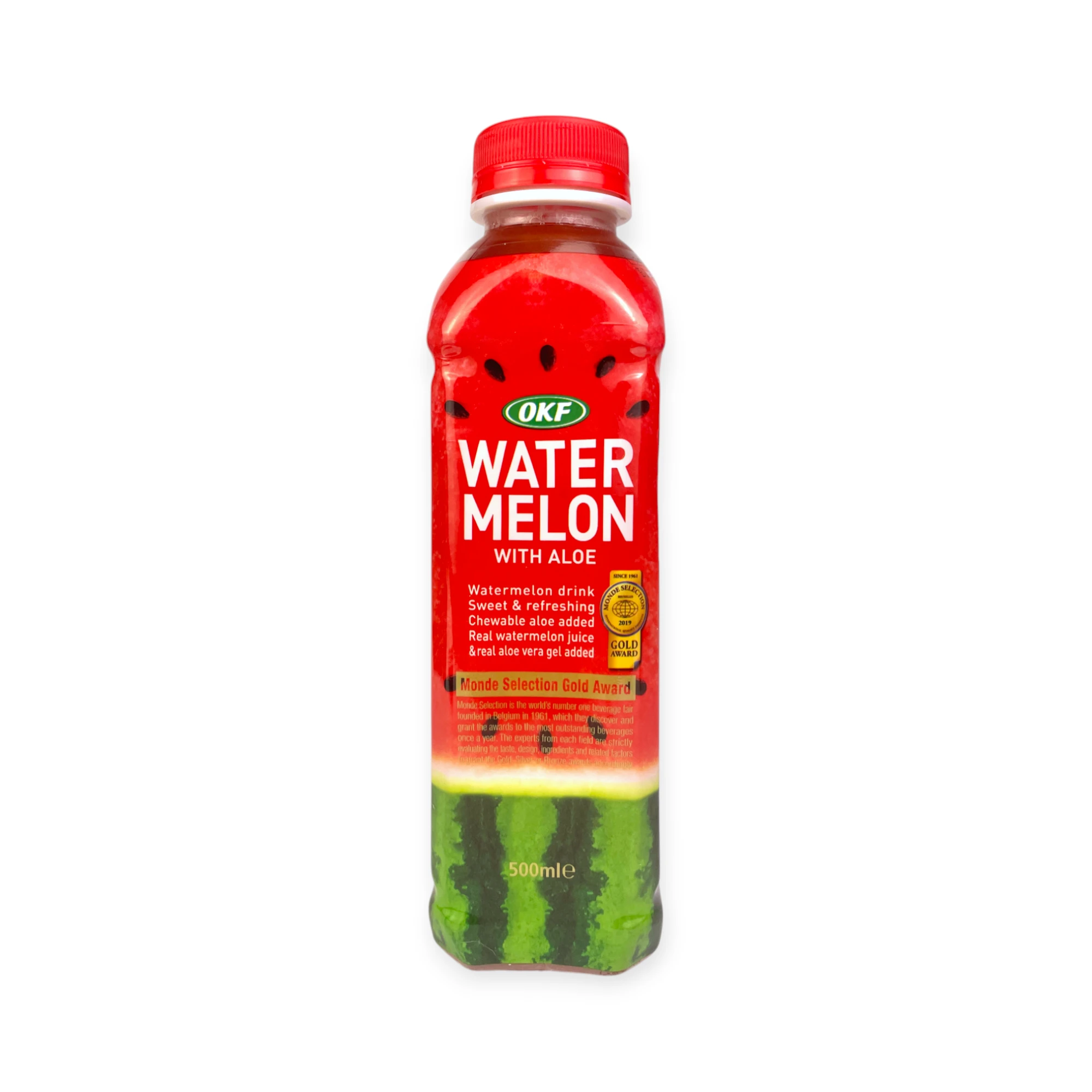 OKF Watermelon with Aloe to koreański napój aloesowy z dodatkiem soku arbuzowego i kawałków miąższu aloesowego. Marka OKF jest znana z tworzenia orzeźwiających napojów, które cieszą się popularnością zarówno w Korei, jak i na całym świecie. Delikatna słodycz arbuza w połączeniu z aloesem daje wyjątkowo świeży i lekki smak – idealny do picia schłodzony w upalne dni.